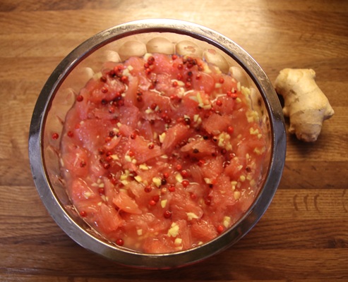 Die Grapefruits filetieren und große Stücke quer durchschneiden. Beim Filetieren den Saft mit auffangen. Ingwer schälen und in kleine Würfelchen schneiden oder fein raffeln, Pfefferkörner zugeben. Das Ganze mischen und mindestens eine Stunde durchziehen lassen.